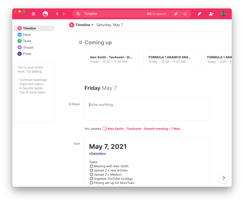 I briefly described above how I use Mem for Todo Lists, but notes is where it really shines. With prebuilt templates for things like meeting notes, a really good Daily View and the ability to add tags to your notes which you can then filter on later it’s overall a really great experience. I also use Mem as a CRM, so when I am in a meeting, I add their name as a tag in the note. This way it becomes super easy to see any outstanding tasks relating to specific people